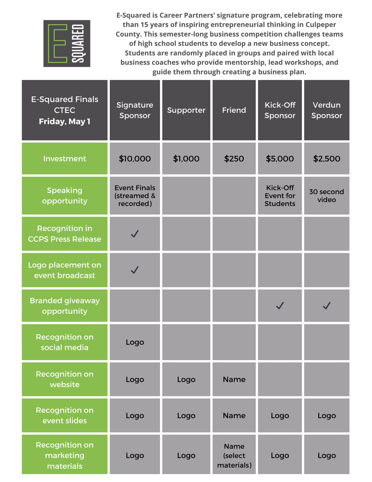 Career Partners programs are made possible through the generosity of local businesses and community partners. Sponsorship opportunities are available for each of our annual programs, giving organizations a meaningful way to invest in students while gaining visibility and recognition within the community.